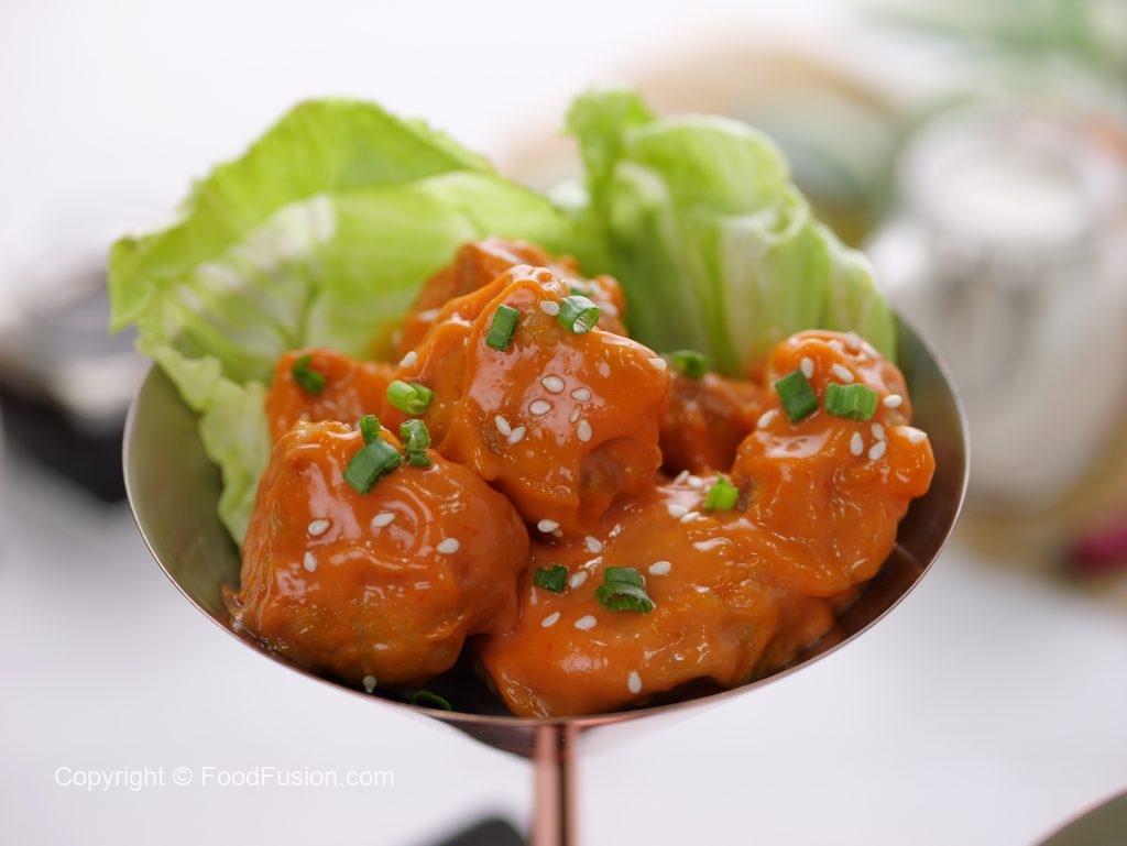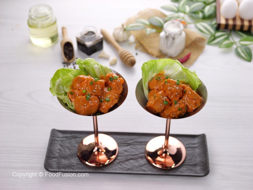 -Serve on iceberg leaves,garnish with sesame seeds & spring onion leaves!