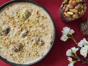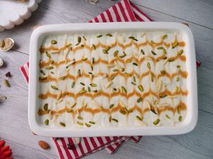 -Add prepared thick milk,pistachios,almonds,caramel sauce,soaked bread slices,thick milk, pistachios,almonds,caramel sauce,soaked bread slices & thick milk.