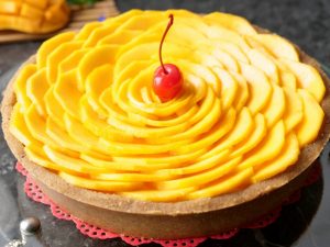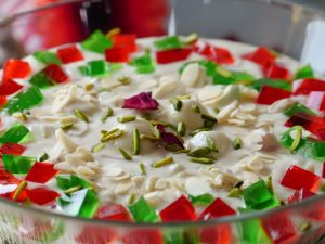 -Dip fried bread pieces in prepared sugar syrup & assemble on custard.