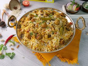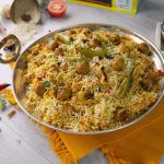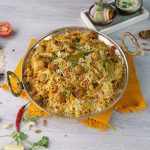-Add lemon juice,fresh coriander,mint leaves,green chillies,fried nuts,boiled rice,orange food color, biryani essence,mint leaves,fresh coriander,green chillies,fried nuts & clarified butter,cover with kitchen cloth & lid and steam cook on low flame for 12-15 minutes.