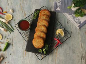 Grease hands with oil,take small quantity of mixture (approx. 50-55g) & make kababs of equal sizes then dip into whisked eggs & coat with breadcrumbs (makes 12-15).