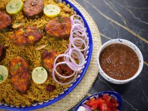 -In a serving platter, add mandi rice, baked fish, garnish with lemon slices, give a coal smoke & serve with prepared mandi sauce & salad!
