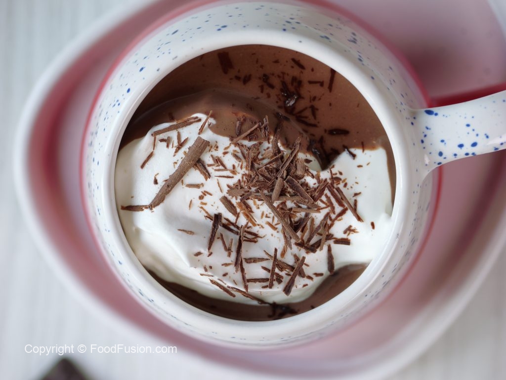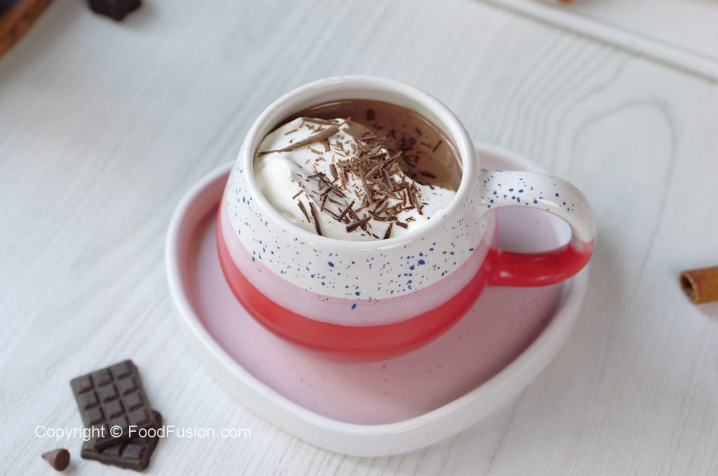 -Serving cup mein hot chocolate,whipped cream aur chocolate shavings dal ker serve karein!
