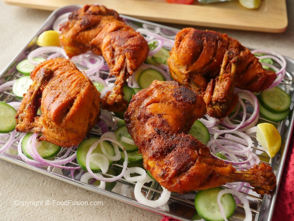 In a wok,add cooking oil,marinated chicken pieces,cover & steam cook on low flame (8-10 minutes each side) then cook on medium flame until water dries up (6-8 minutes).