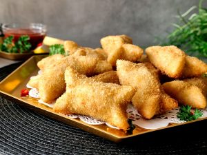 Tayyar chicken curry filling ko dough ka center mein dal dein,edges per pani laga lein aur do opposite sides ko stick ker lein phir remining sides ko bhi stick ker ka properly seal ker lein (makes 25-26).