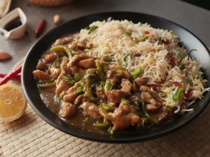 -Fried rice ko Chicken Mongolian ka saath serve karein.