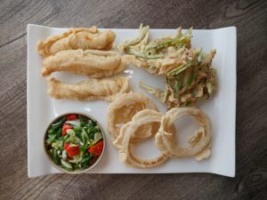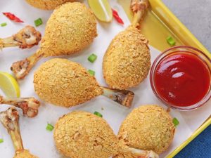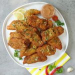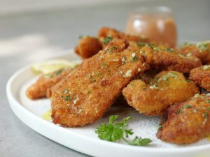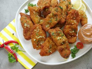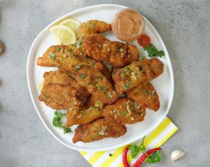 -Now coat marinated strips with all-purpose flour than dip in whisked eggs & coat with breadcrumbs.