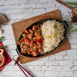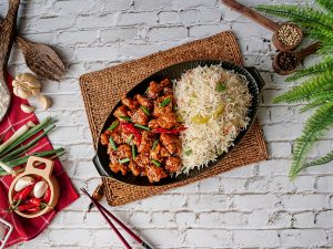 Garnish with sesame seeds,green onion leaves & serve with fried rice.