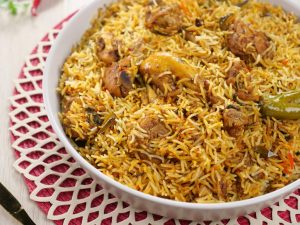 -Add mint leaves,fresh coriander,green chillies,boiled rice,mint leaves,fresh coriander,green chillies, fried onion,orange food color & desi ghee,cover with kitchen cloth & lid and steam cook on low flame for 10-12 minutes.