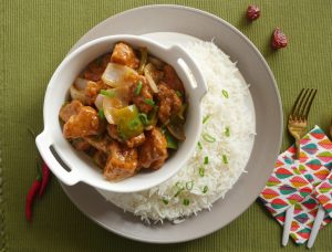 Garnish with green onion leaves and serve with rice.