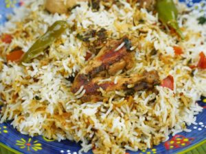 For biryani layering,add chaat masala,whole spice powder,yogurt,mint leaves,green coriander,fried onion,tomatoes,green chilies,boiled rice,fried onion,green coriander,mint leaves,tomatoes,kewra essence and oil.
