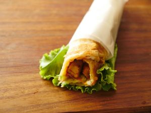 On fried paratha,add mayonnaise,tomato ketchup,mustard paste,cucumber,carrot,fried chicken chunks and wrap & serve.
