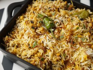 Fried pyaz,boiled chawal,fried pyaz,hara dhania,podina,hari mirchein,zarda ka rang,kewra water aur ghee dal ker dhak dein aur halki ancch per 8-10 minutes kliya dum per rakh dein.
