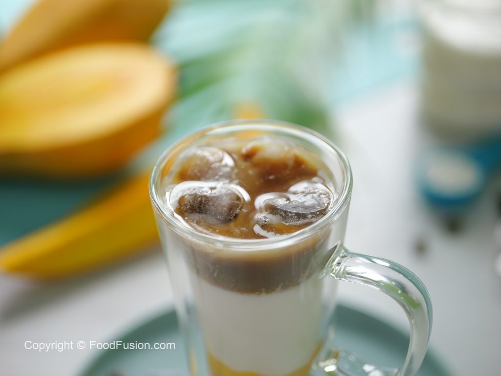 -In a glass,add mango puree (2-3 tbs),ice cubes,prepared milk mixture (1/2 Cup),dissolved coffee (2 tbs),mix well & serve!