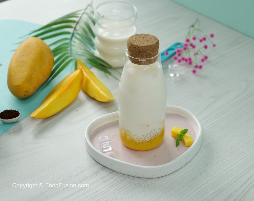 -Glass bottle mein tayyar mango puree (2-3 tbs),boiled sagudana (2 tbs),condensed milk mango chunks,ice cubes aur doodh dal ker stir ker lein & serve karein!