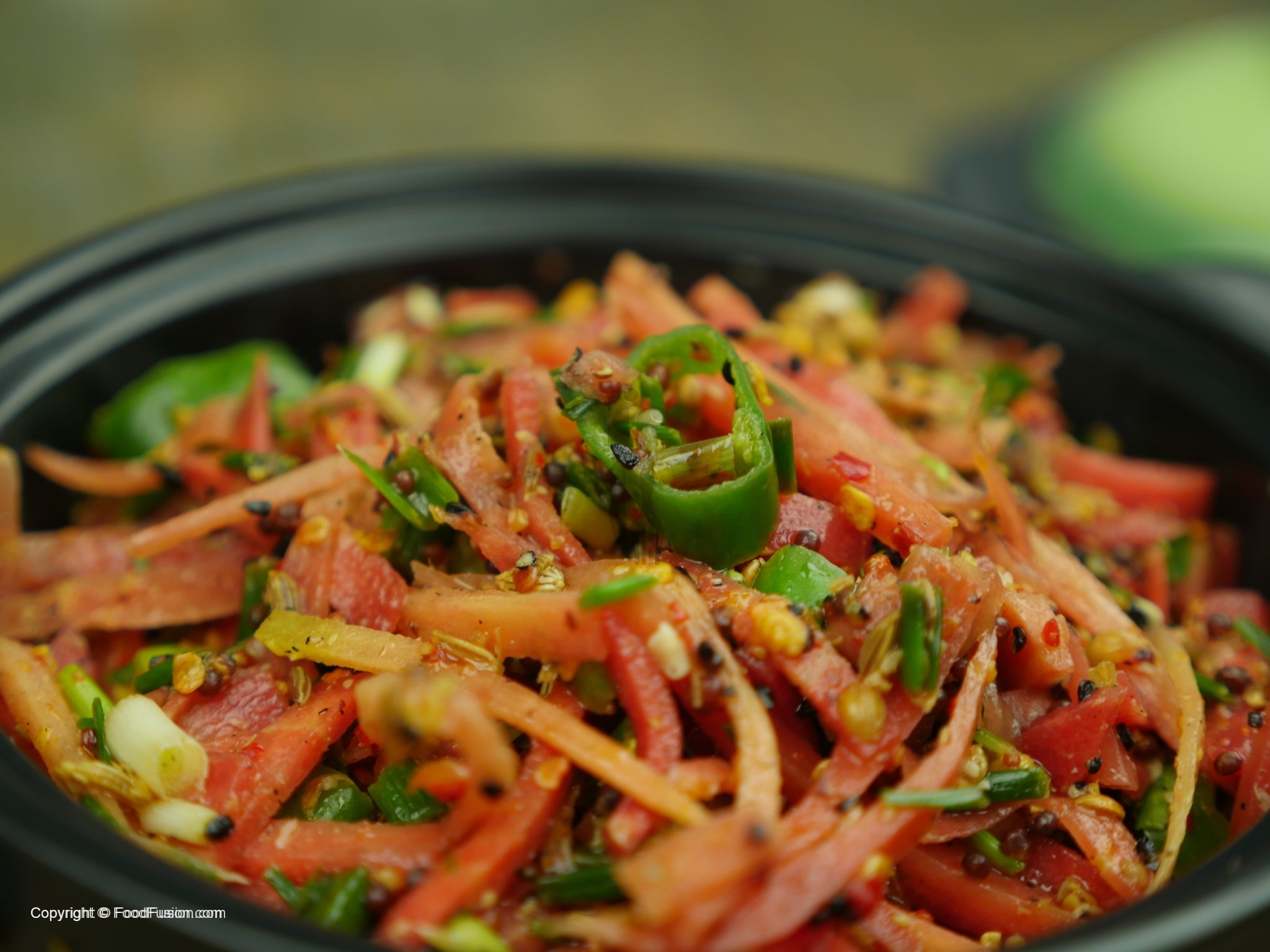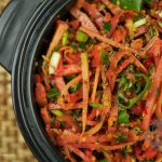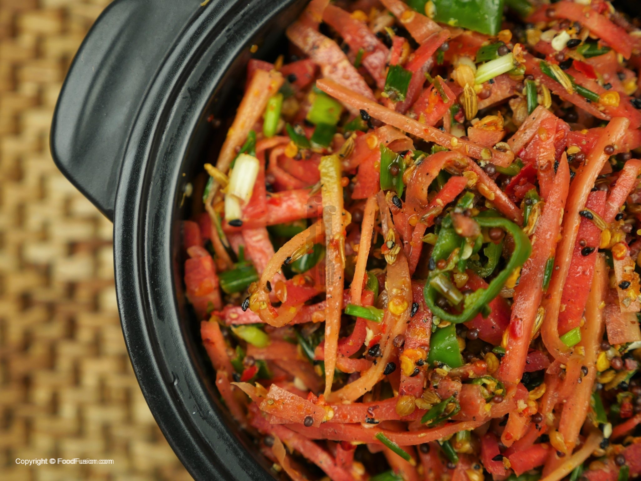 In bowl,add oil,nigella seeds(crushed),mustard seeds (crushed),coriander seeds(crushed),salt,red chili flakes,fennel seeds (crushed),tarti,garlic paste,green garlic,green chili and carrots.