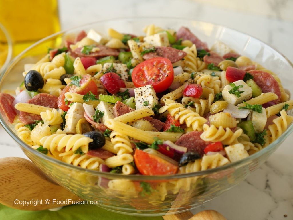 -Red bell pepper,kheera,black olives,green olives,cherry tomatoes,shimla mirch,beef pepperoni, pyaz,cottage cheese aur fresh parsley dal ker ache tarhan toss ker lein.