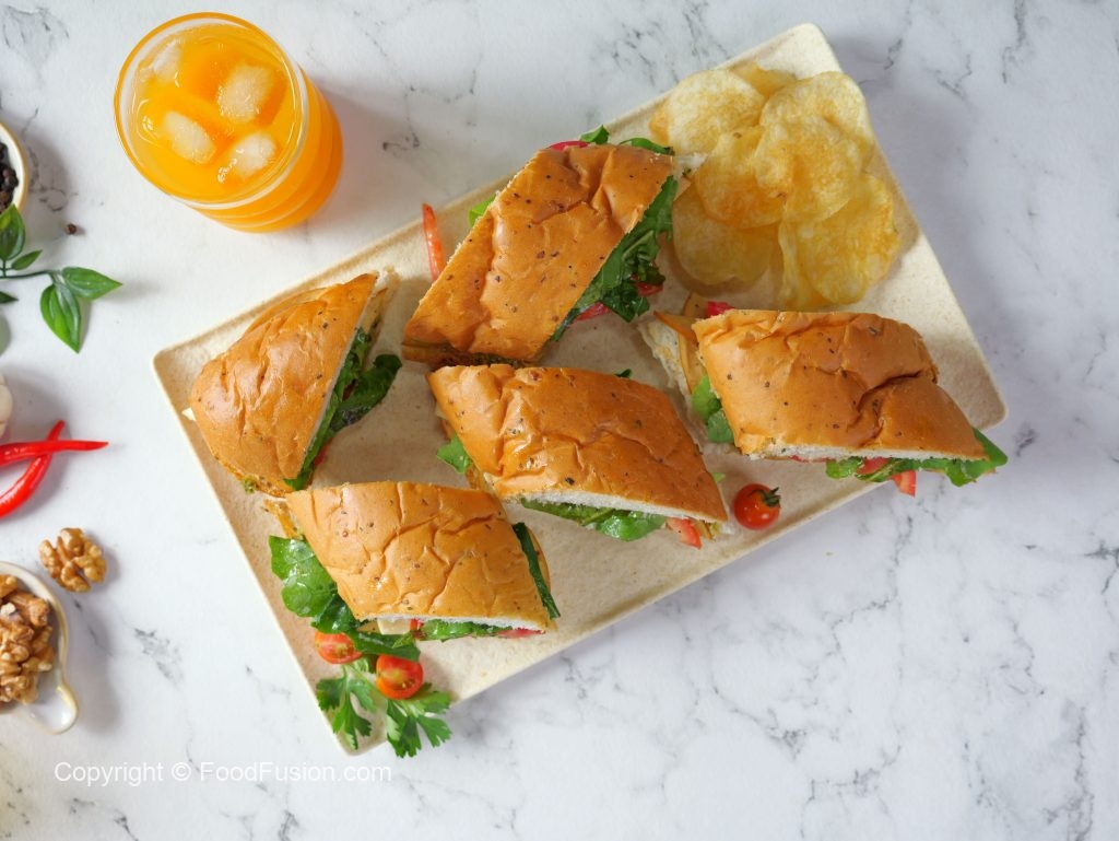 -Add & spread prepared pesto,mortadella slices,cheese slices,tomato slices,rocket leaves,olive oil,pink salt,black pepper powder & cover with top.