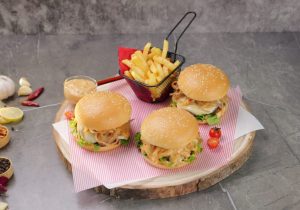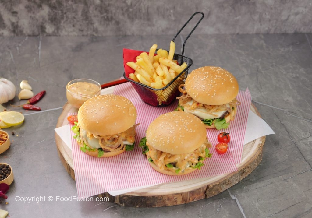 -On burger bun,add & spread jalapeno burger sauce,lettuce leaves,cheese patty,onion rings,jalapeno burger sauce & top with another bun to make a burger (makes 5).