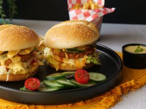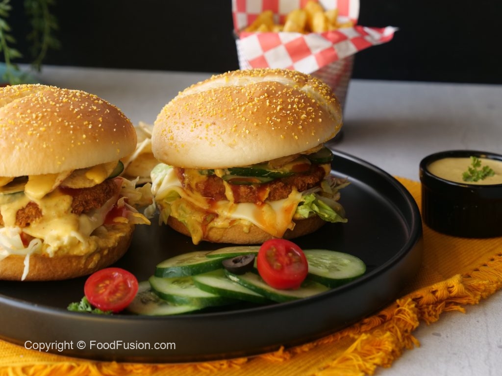 -On a burger bun,add & spread prepared jalapeno mayo sauce,add iceberg,cheese slice,fried veggie burger patty,tomato ketchup,cucumber,bakery chips,prepared jalapeno mayo sauce & cover with top burger bun (makes 4) & serve!