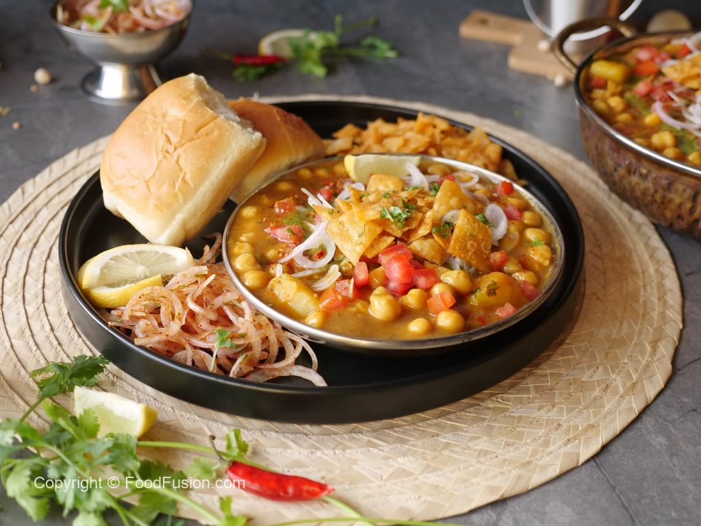 -Serving plate mein khathiawari choley,tayyar hari chutney,tamatar,chaat masala,lal mirch crushed, pyaz,papri aur hara dhania dal dein aur pav buns ka saath serve karein!