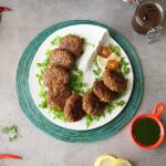 -Grease hands with oil,take a small quantity of mixture (50g),make a ball & flatten on your palm,add prepared filling,cover properly & make kebabs of equal sizes (makes 11-12).
