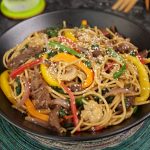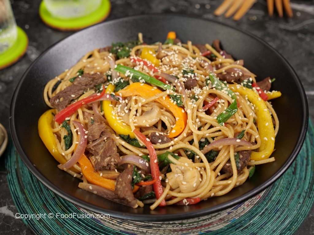 Add beef strips,wilted spinach & mix well.
