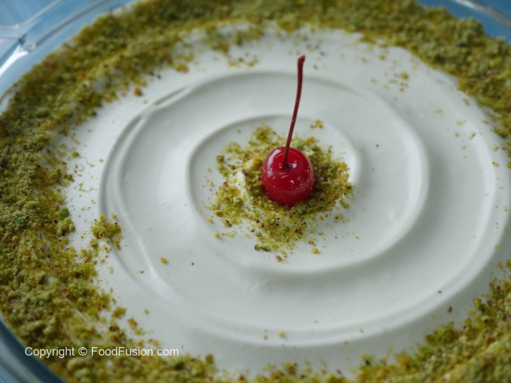 Serving dish mein tayyar cream ki layer dal ker evenly pheela lein.
