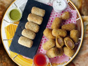 -Dip stuffed potato in whisked eggs & coat with breadcrumbs then again dip in whisked eggs & coat with breadcrumbs.