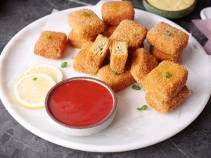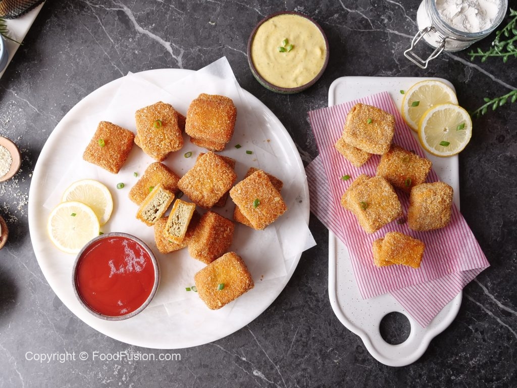 -Now dip nuggets into prepared flour batter & coat with breadcrumbs (makes 40).