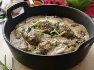-Tayyar creamy yogurt sauce drizzle karein,hara dhania chirak dein,rice,naan ya sautéed vegetables ka saath serve larein!