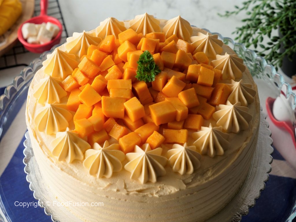 Sponge cake ki base per mango puree aur mango frosting dal ker pheela lein aur mango cubes dal dein,mango frosting dal ker upper sa cake ki top layer rakh ker gently press ker lein.