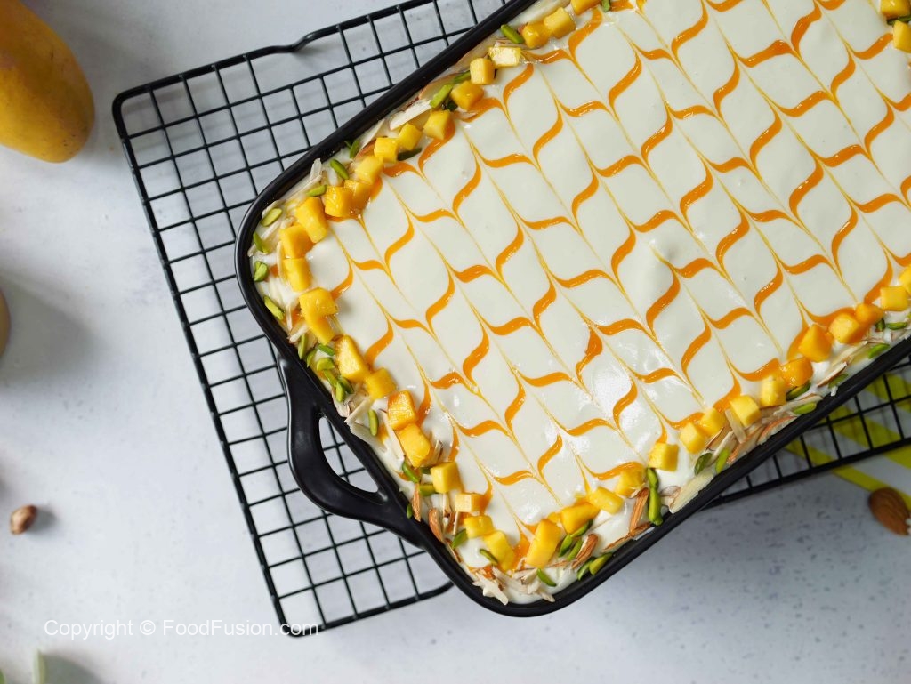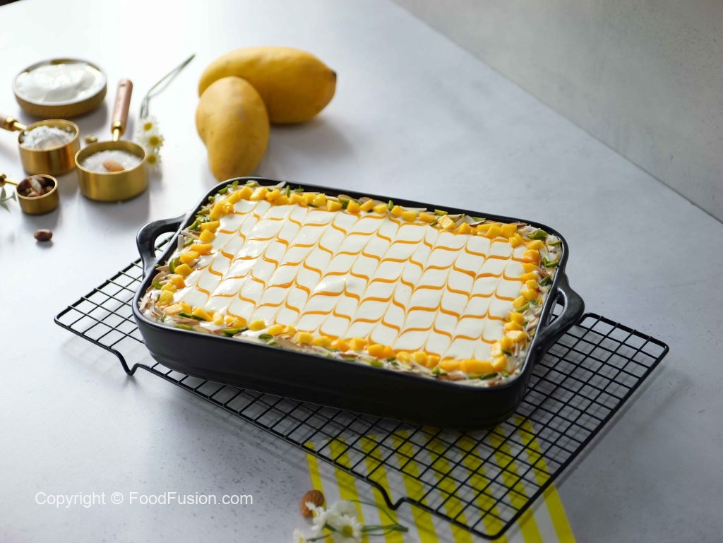 -Add & spread prepared cream mixture & garnish with prepared mango puree,almonds,pistachios & mango cubes.