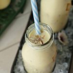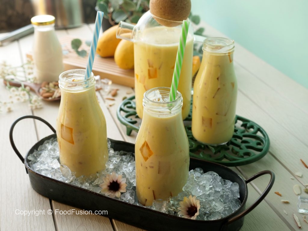 Serving bottle mein mango jelly cubes,tayyar doodh aur badam dal dein.
