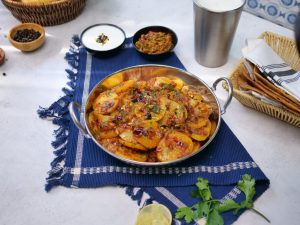 -In a serving plate add aloo katli. Garnish with fresh coriander, reserved curry leaves & red chillies.