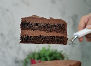 -Place first layer of cake on cake stand & apply prepared chocolate frosting.