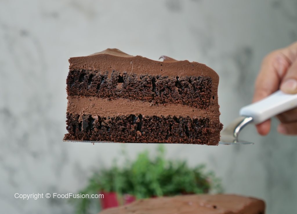 -Ek aur cake layer rakh dein aur tayyar chocolate frosting laga lein aur cake ki sides ko frosting sa cover ker lein aur 2 hours kliya refrigerate ker lein.