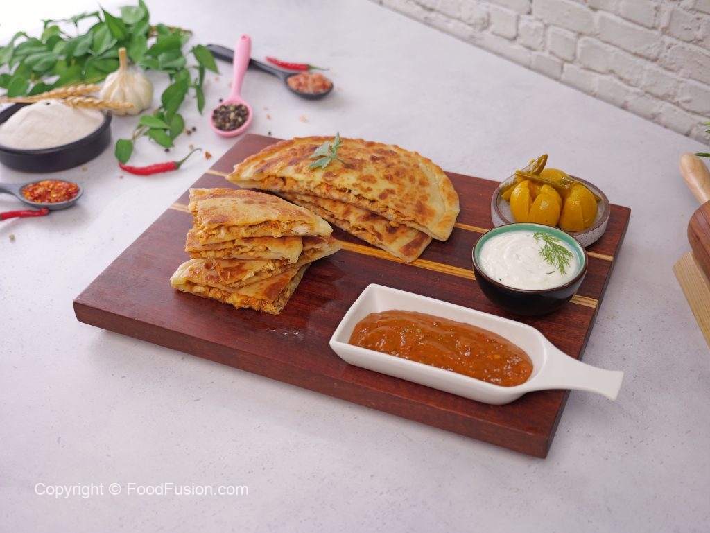-On one rolled dough, spread mayonnaise, prepared chicken filling, mix cheese, prepared hot mustard sauce (1 tbs) & place another rolled dough over it & seal properly.