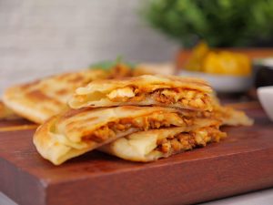 -Aik rolled dough par mayonnaise lagaen, prepared chicken filling, mix cheese aur prepared hot mustard sauce (1 tbs) daalein, phir doosri rolled dough upar rakh kar achi tarah seal kar den.