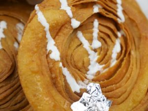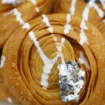 Cutter ki madad sa puri dough ko strips (about 1 inch) ki shakal mein cut ker lein aur swiss roll ki tarhan roll karein,dosri strip k upper roll rakh k phr sa swiss roll ki tarhan roll karein aur end ko stick ker dein,dry wheat flour mein coat ker lein.