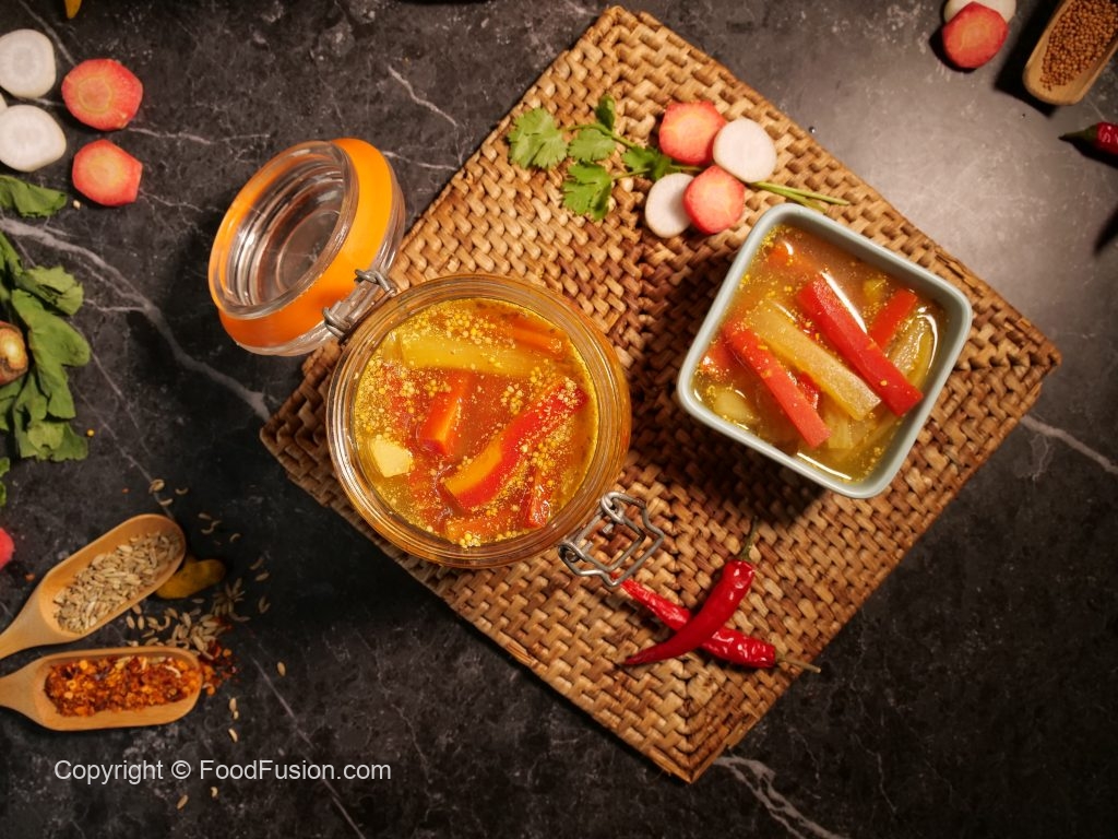 -Bowl mein blanched vegetables,namak,lal mirch crushed,haldi powder,coarsely crushed saunf & raidana aur sirka dal ker ache tarhan mix karein aur dhak ker overnight kliya room temperature per chor dein.