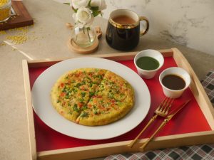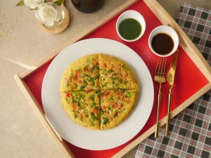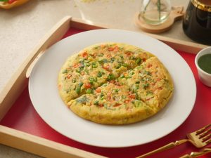 Shimla mirch,tamatar,pyaz aur hara dhania dal ker gently press karein aur flip ker lein.