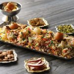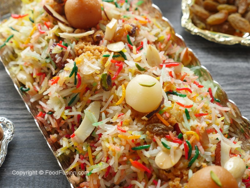 Fried khoya,green colored chawal,red colored chawal aur yellow colored chawal dal dein.
