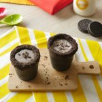 Oreo shots ko molds mein sa nikal lein aur oreo shots glasses ki rims ko cream mein dip ker ka crumbled oreo biscuits mein coat ker lein.