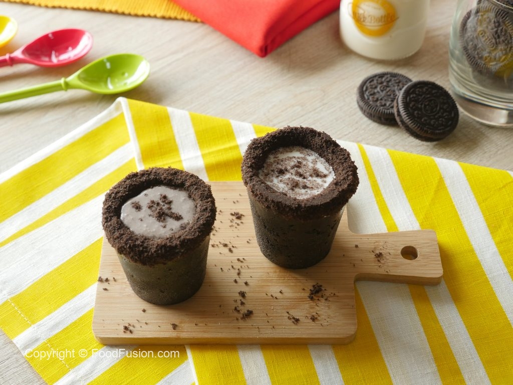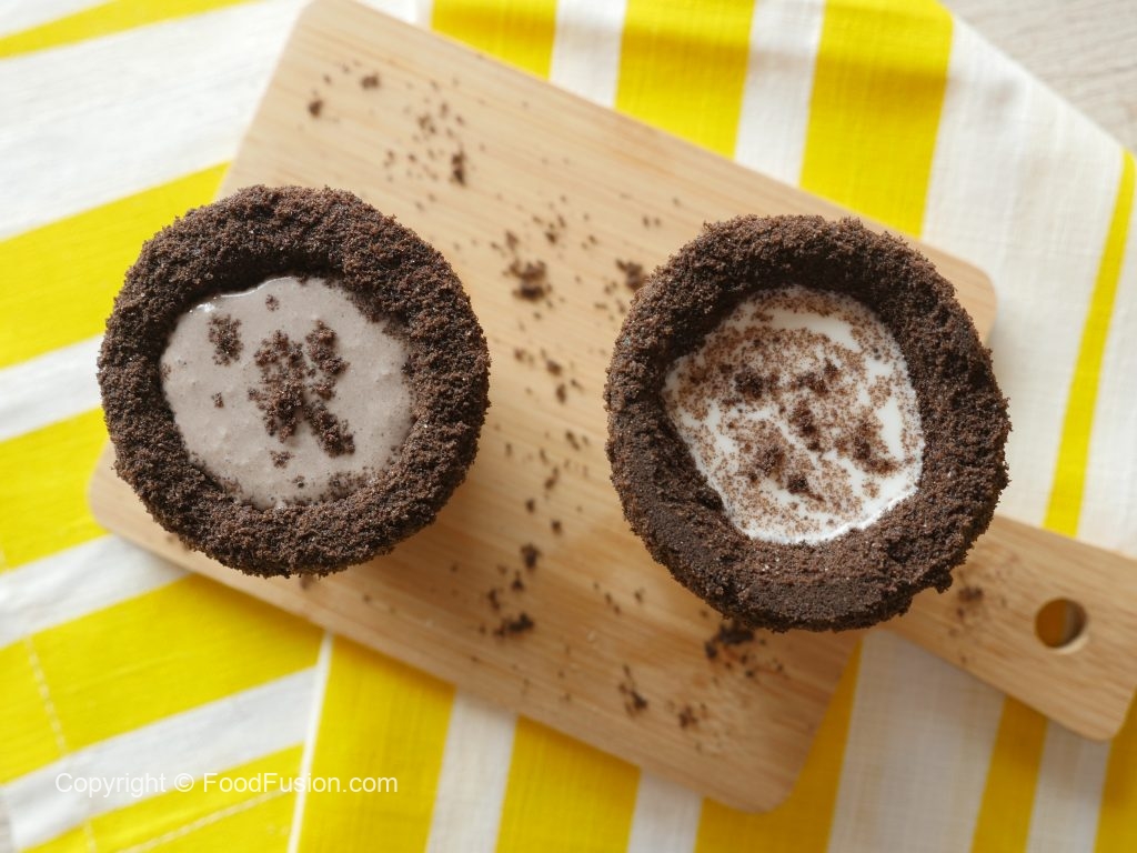 Dosray mold ki madad sa gently press ker ka mold ka ander oreo shots bana lein aur 30 minutes kliya freeze ker lein (makes 4).