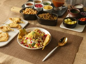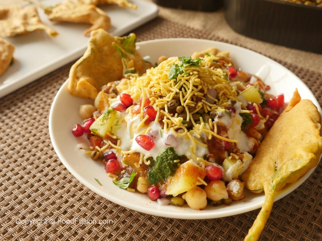 Platter mein palak pakora,hari mong daal,chanay,aloo,pyaz,tamatar,dahi,tayyar hari chutney,tayyar khatti chutney,nimco sev,anaar,lal mirch crushed,chaat masala aur hara dhania dal ker serve karein.