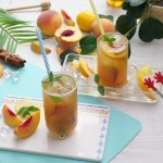 -Serving glass mein ice cubes,peach slices,tayyar green tea (3/4 cup),tayyar peach mixture (1/4 cup) aur podina dal ker stir ker lein.