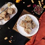-On a greased mold,add peanuts,prepared barfi & spread evenly.