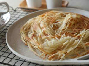 Add & spread ghee,sprinkle dry flour and cut into thin strips with cutter.