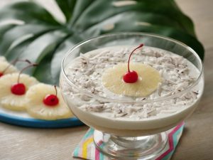 Sprinkle fresh coconut and top with cherry.